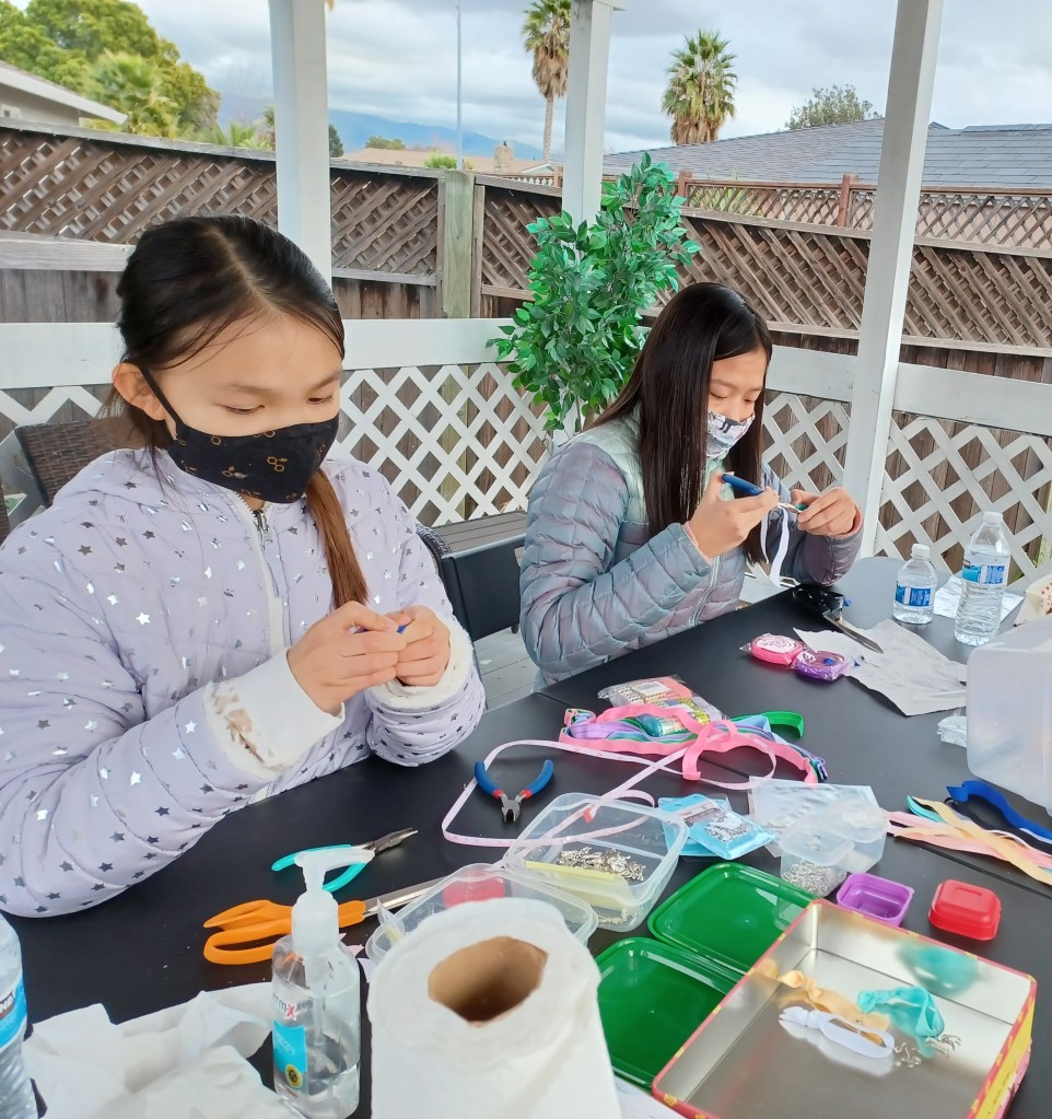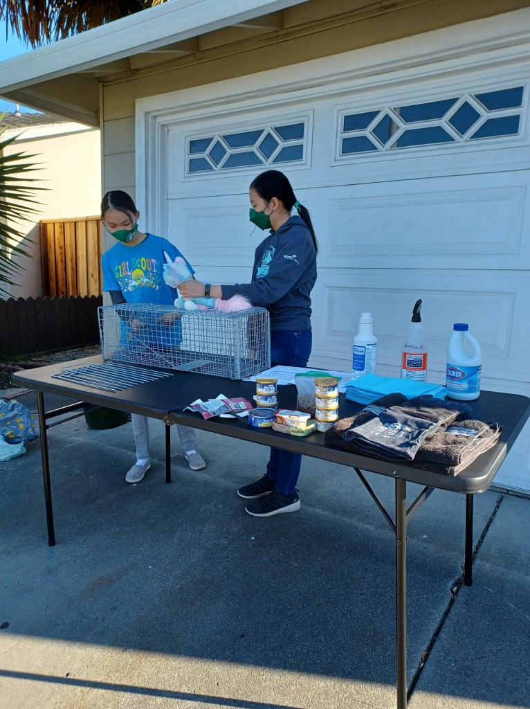 In the image above, Ms. Sarah Wood from Ohlone Humane Society showed us the trapping procedure of the TNR process. She taught us how to trap a community cat using a specific type of cage; what kind of food that is needed as bait; and so much more. We used what we learned from Ms. Sarah and the brochures she gave us to make our educational YouTube videos.In the above image, we were explaining the trapping process of TNR for our Mock Trapping Demonstration video. This was our first take. The entire final video can be found under the Educational Video section of this website (scroll to the top).The above image shows the two of us shopping at Michaels for our fundraiser project. We purchased pliers and jump rings to make our hair ties. Our other shopping place was Amazon, where we bought elastic bands and more pliers. Here we are working on our hair ties for our fundraiser. We used two different pliers to open up the jump rings and loop the charms through as well as the elastic bands. We had to be very careful not to damage the charms or the bands. Each hair tie we made is individually unique. Thank you to our customers for supporting our fundraiser. Your contribution went to a good cause!We met Ms. Diane Shaw, Vice President and Membership/Donation Manager of Ohlone Humane Society. The above photo shows Ms. Diane with the two cages we donated. They are filled with first aid kits and some cat food. These items are very useful for the TNR process. This picture also shows us wearing our custom made tee shirts for our Silver Award Project. Here is a close up of some of the items that we donated to Ohlone Humane Society. We provided some can foods, flashlights, puppy pads, paper towels, and much more.